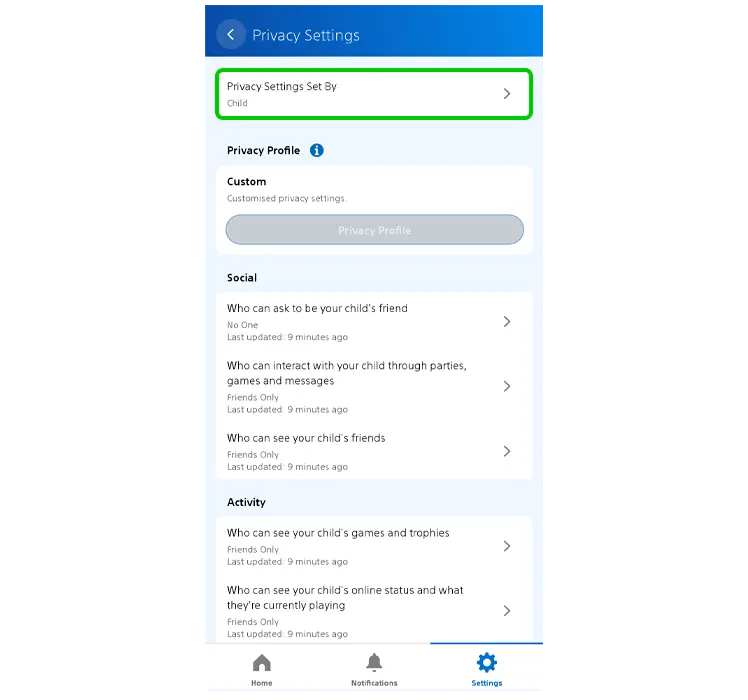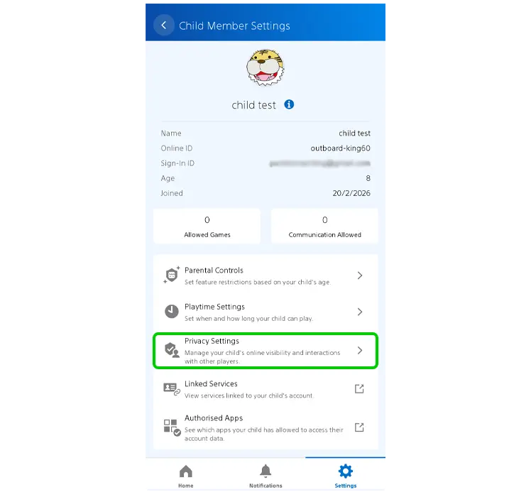 Étape 1 – Dans le menu Paramètres de votre enfant dans l'application PlayStation Family, sélectionnez Paramètres de confidentialité .