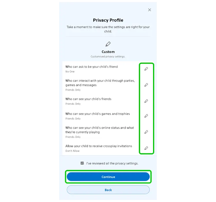 Étape 18 - La revue chaque réglage sous Profil de confidentialité et assurez-vous que «Autorisez votre enfant à modifier ce paramètre' est tourné de rabais (Le bouton gris indique que la fonction est désactivée) pour chaque réglage.