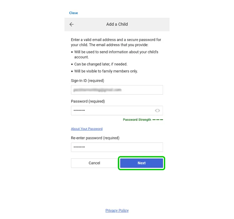 Étape 4 – Saisissez les coordonnées de votre enfant date de naissance réelleCes informations ne seront partagées avec personne, mais elles faciliteront la configuration des commandes de sécurité. Appuyez sur Suivant.