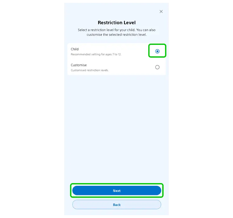 Étape 6 – Choisissez le niveau de restriction de votre enfant.Enfant« Cela dépend de l’âge que vous avez indiqué, que vous pouvez personnaliser davantage. C’est l’option la plus simple. » Appuyez sur Suivant.