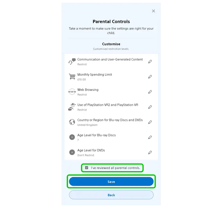 Si votre enfant utilise une PS4, vérifiez chaque paramètre comme indiqué ci-dessus. Sinon, appuyez sur Enregistrer.