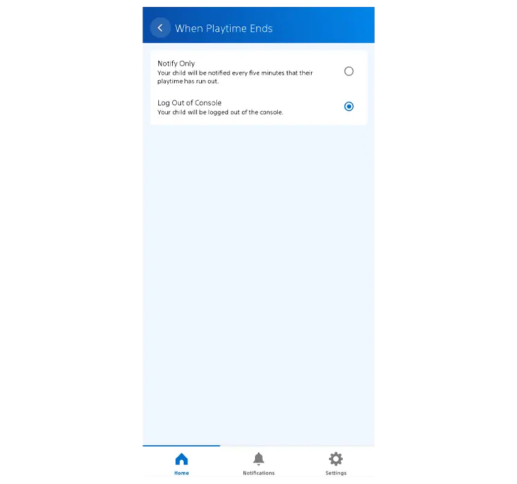 Étape 10 – Décidez si votre enfant recevra un déclaration toutes les cinq minutes, lorsque leur temps est écoulé ou si la console le souhaite déconnectez-les.