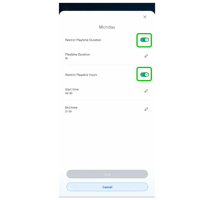 Étape 6 – Pour l’option journalière, sélectionnez chaque jour de la semaine et allumez le Bascule pour Limiter la durée du temps de jeu et Limiter les heures de jeu.