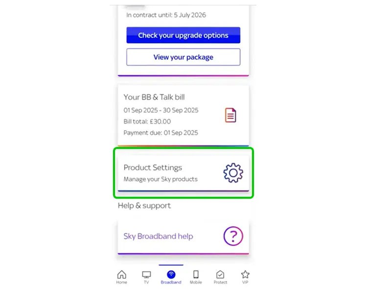 Step 1 – From the Broadband tab in your My Sky app, scroll down and tap Product Settings.