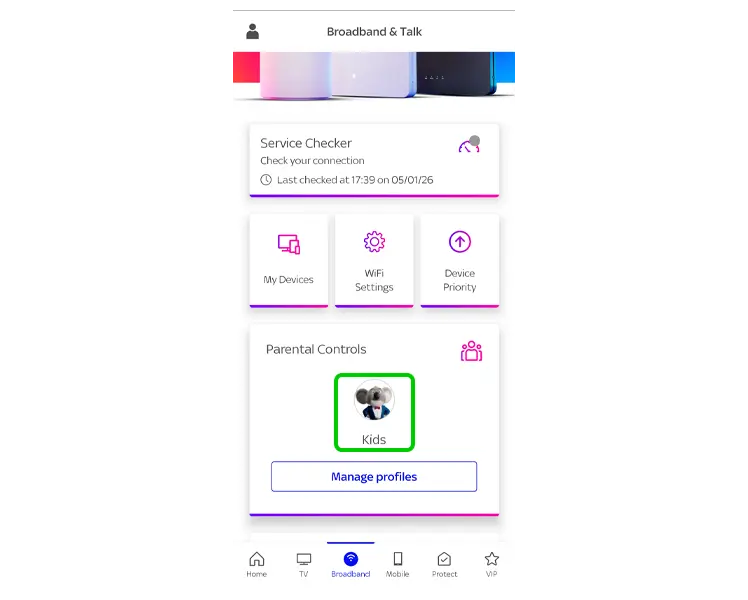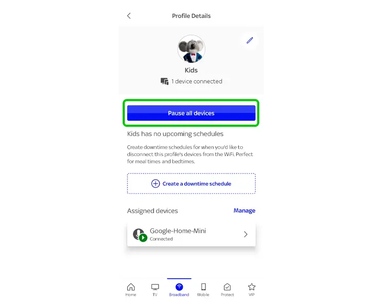 Step 1 – From the Broadband menu in your My Sky app, tap the profile you want to pause WiFi access for.