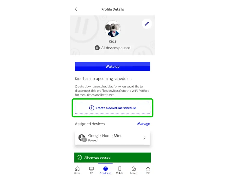 Step 1 – From the Broadband menu in your My Sky app, select the profile you wish to set downtimes for.