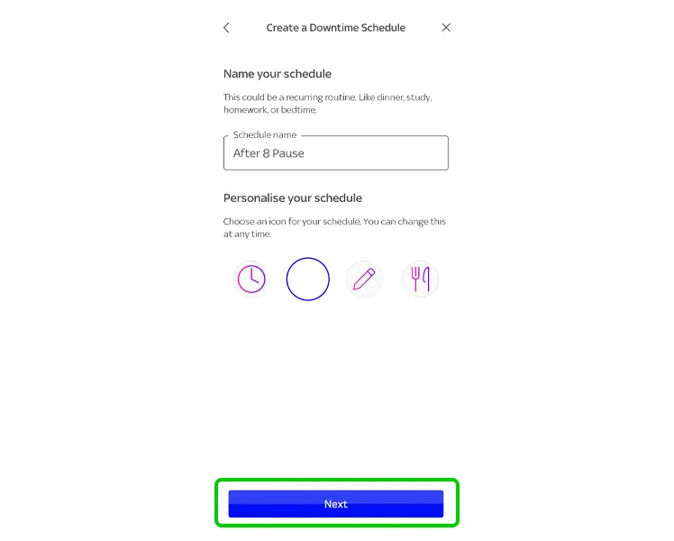 Step 3 – Tap Create your first schedule and choose a name and icon for the schedule. Tap Next.