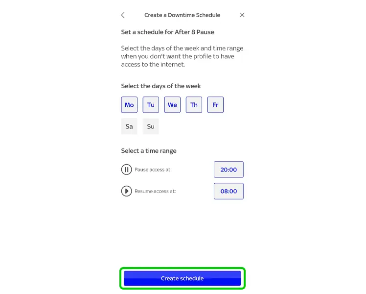 Step 4 – Select the days and times you’d like downtime to start and end. Tap Create schedule.