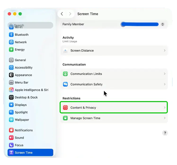 Step 10 – Scroll down to and click on Content & Privacy.