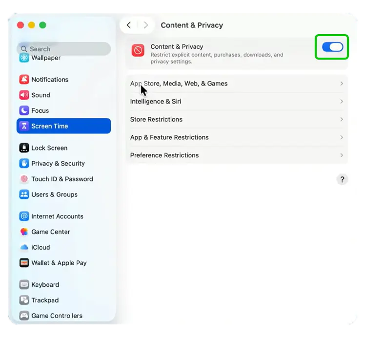 Step 11 – Click the toggle next to Content & Privacy to turn restrictions on.