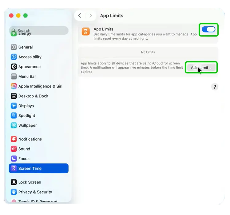 Step 6 – Click the toggle next to App Limits to turn them on and then click Add Limit… to customise your child’s app restrictions.