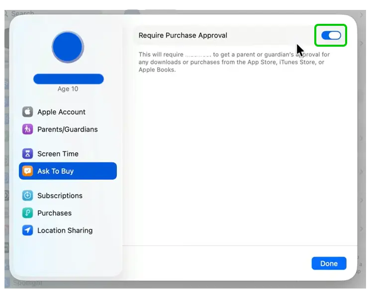 Step 3 – Select Always so that apps with age restrictions can ensure your child meets age requirements. You can also select Ask First or Never. Click Done. Click Done again.